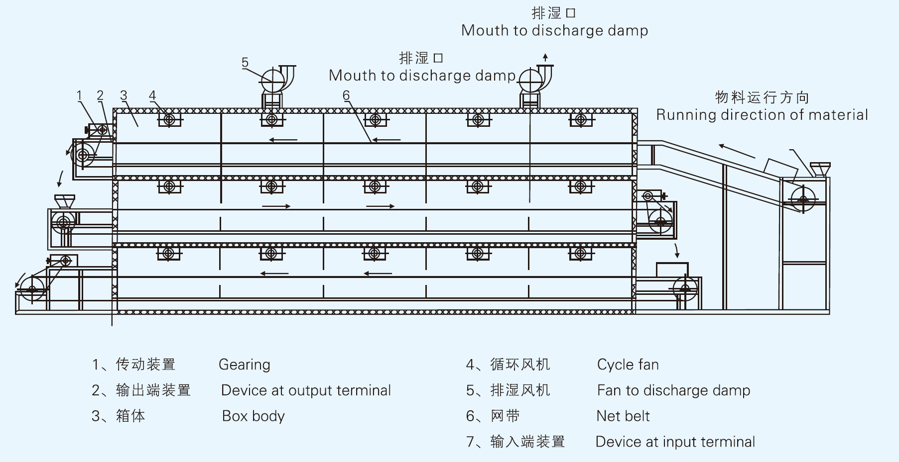 The belt drier is a continuous drying equipment in batch production. It is suitable for drying the raw materials that is in the shape of piece, strip or granule and is good in permeability. Particularly it is suitable for such raw materials that contain high moisture and are not permitted high temperature for example, dehydrated vegetable, catalyst, drinking tablet of Chinese traditional medicine. Its features are fast in drying speed, strong in vaporization, good in quality of products.Typical products Dehydrated vegetable, granule feed, monosodium glutamate, check extraction,organic pigment,synthetic rubber, propylene fiber, medicine, medical material, small wooden products, plastic products, aging or solidifying for electronic elements. For pasted raw material such as filter cake, it can be dried after shaped through granulator or extruder.