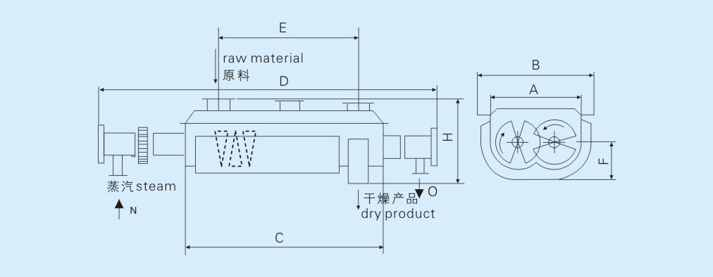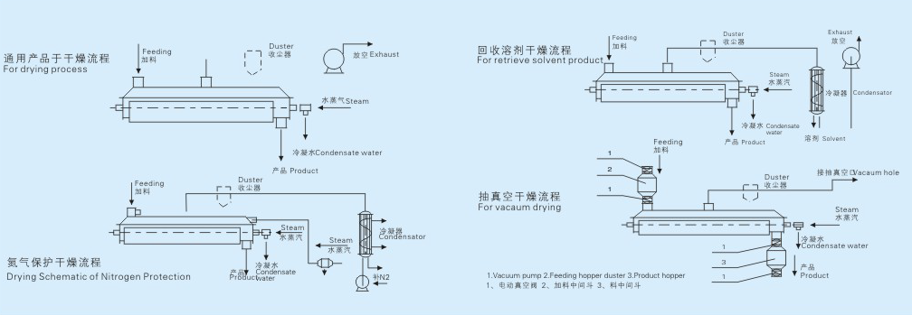 The hollow paddle dryer can indirectly heat or cool paste, granular, powdered, and slurry materials, and can complete unit operations such as drying, cooling, heating, sterilization, reaction, and low-temperature calcination. The special wedge-shaped stirring heat transfer paddles in the equipment have high heat transfer efficiency and self-cleaning function of the heat transfer surface.